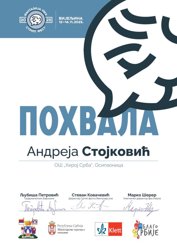 Ученик 8.разреда наше школе, Андреја Стојковић, заслужује посебну похвалу за успешно учешће на Стрип фесту „Фантазија ума“ 2025. године, где је показао креативност, маштовитост и посвећеност у изради стрипа. Својим